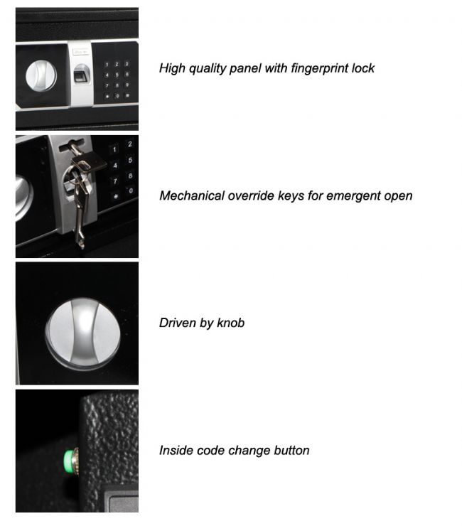 - Different ways to open the safe: code and fingerprint.